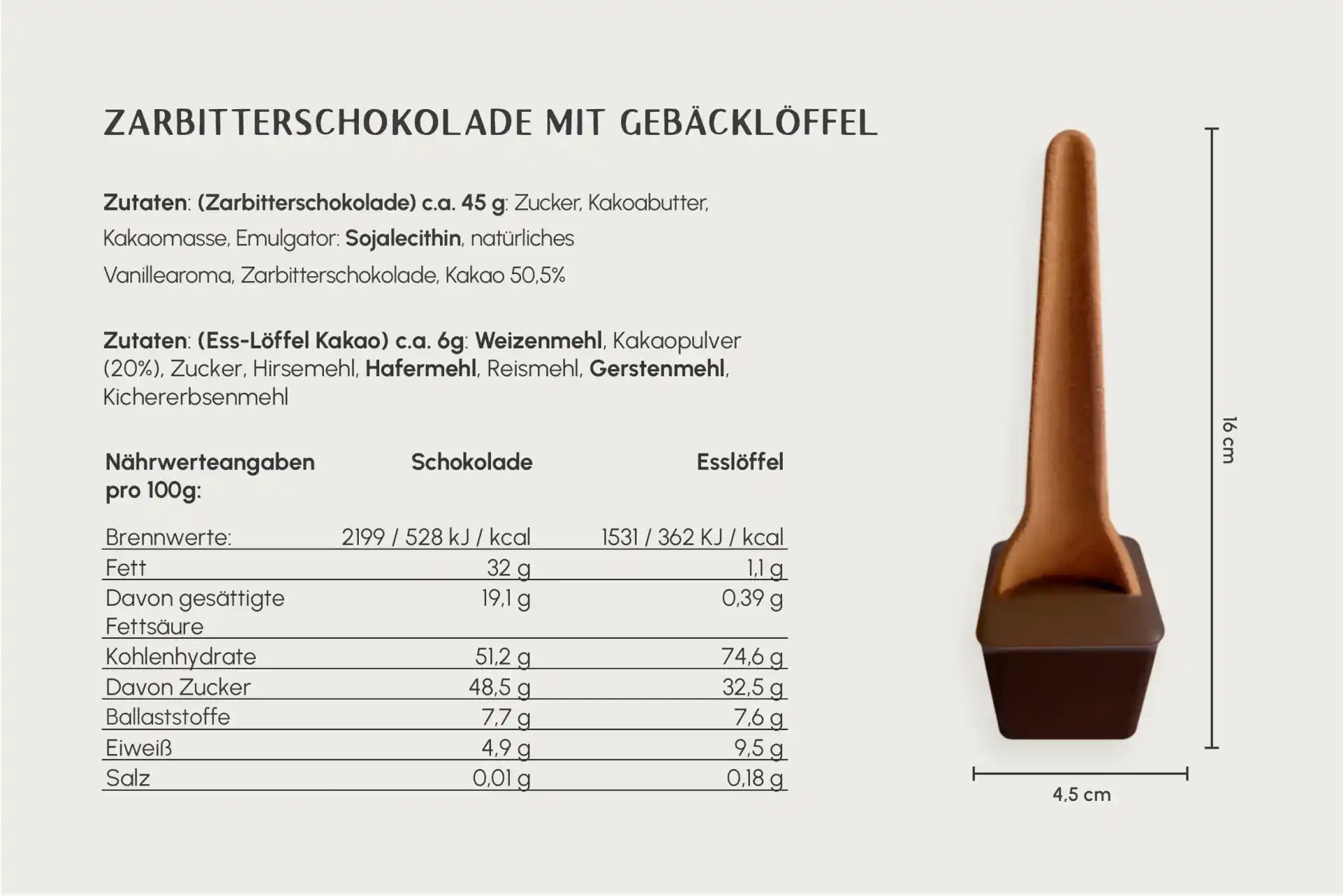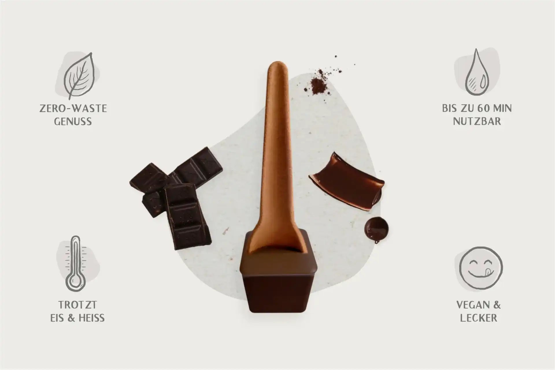 Während die Schokolade in heißer Milch zergeht, kannst Du mit unserem essbaren Löffel Dein Heißgetränk umrühren und diesen dann im Anschluss, wie ein Keks verputzen.